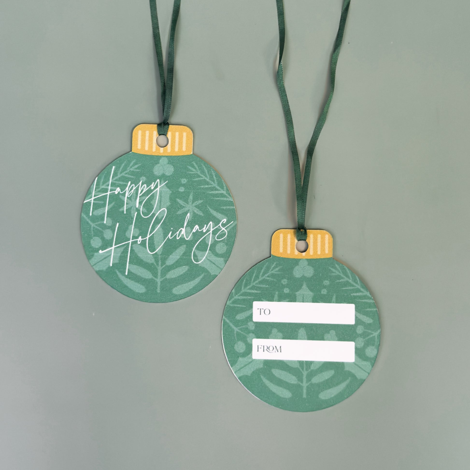 Celebrate the season with these elegantly crafted Happy Holidays gift tags, shaped like classic ornaments. Printed on premium 100lb C Mohawk Eggshell White paper, they offer a smooth, durable surface for writing names on the back. These sophisticated tags add a refined touch to your holiday gifts, making every present feel thoughtfully wrapped and personalized.